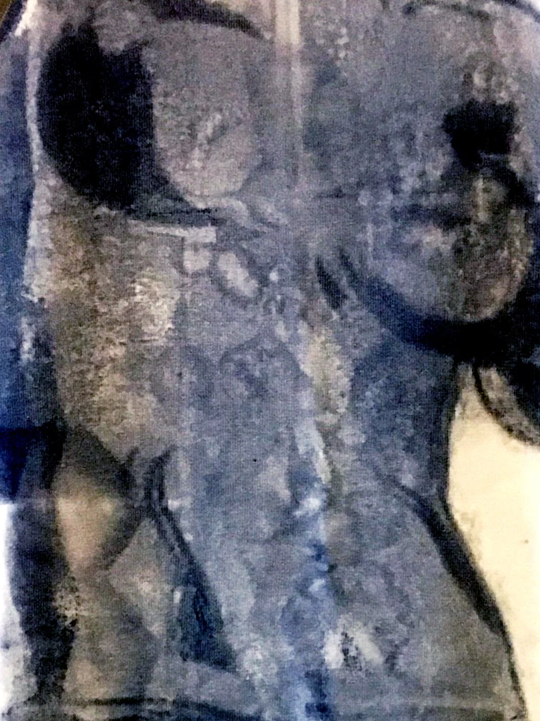 You've just come in and an indefinite article greets you, (artist displays artist’s own dress with imprint of nude) and it takes you all the way back to the beginning. And it says “Here you are painting Venus, as you always have nude, and leaning”
