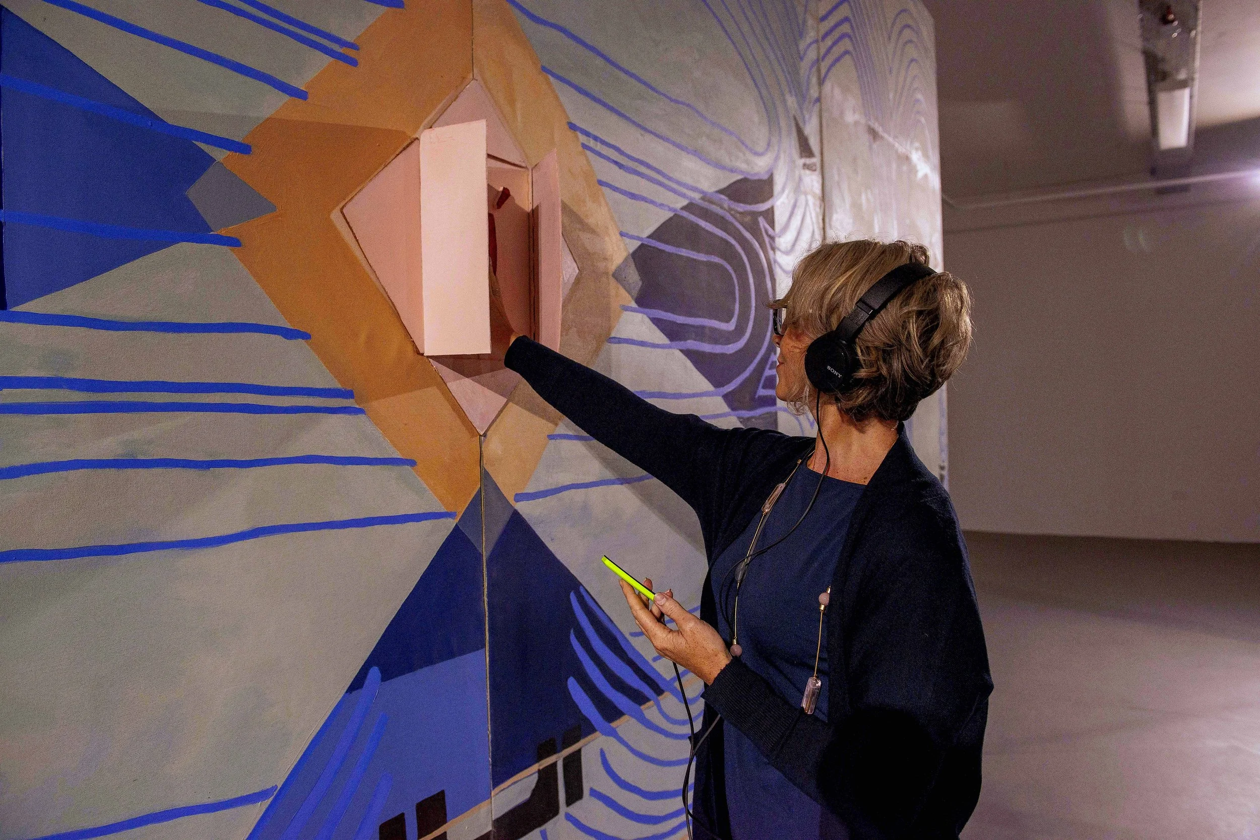 See, I've already pictured this. Right now we are all on our feet, I'm looking down at my phone, and I'm looking especially great, and you're a captivated audience. I'm telling you what an app is saying to me, and we're walking around the exhibition, me under its spell, you under mine. And pointing to the phone, - I go straight into the app's technology pitch. Which says - 100,000 years ago, we had stories and those stories made pictures on the wall, and people got friendlier looking at them, talking about them. 3,500 years ago we got the alphabet and started writing to each other and collecting everything that began with a letter, and we got even friendlier. 28 years ago we got powerpoint and shortly afterwards the internet, and we made loads of cash together and that way we all got a lot friendlier.Today we have apps and we share everything now, we are all friends, everybody in the whole world. And it was all So-Easy.